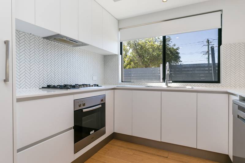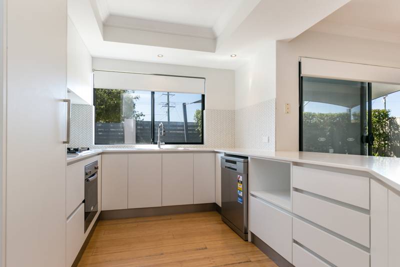Gleaming bamboo floorboards warm an open-plan living and dining area that incorporates a cleverly-renovated kitchen into its practical design. There, sparkling stone bench tops complement an Omega five-burner gas cooktop/oven, a Technika dishwasher, double sinks, feature tiled splashbacks, soft-closing drawers and ample over-head and under-bench storage options.