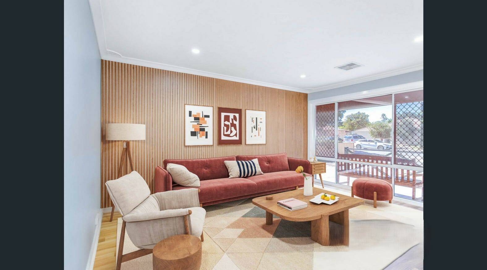 Bright living room with modern cladding feature wall
